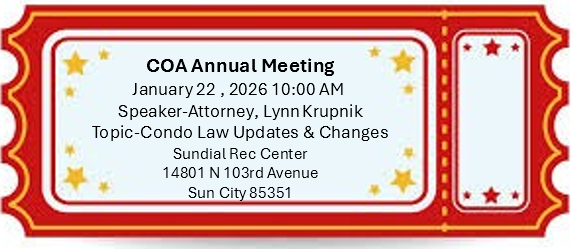 This event is open to all COA members–no registration necessary.We are looking forward to seeing you there!COA Annual MeetingJanuary 22, 202610:00 AMSundial Rec Center14801 N 103rd AvenueSun City 85351